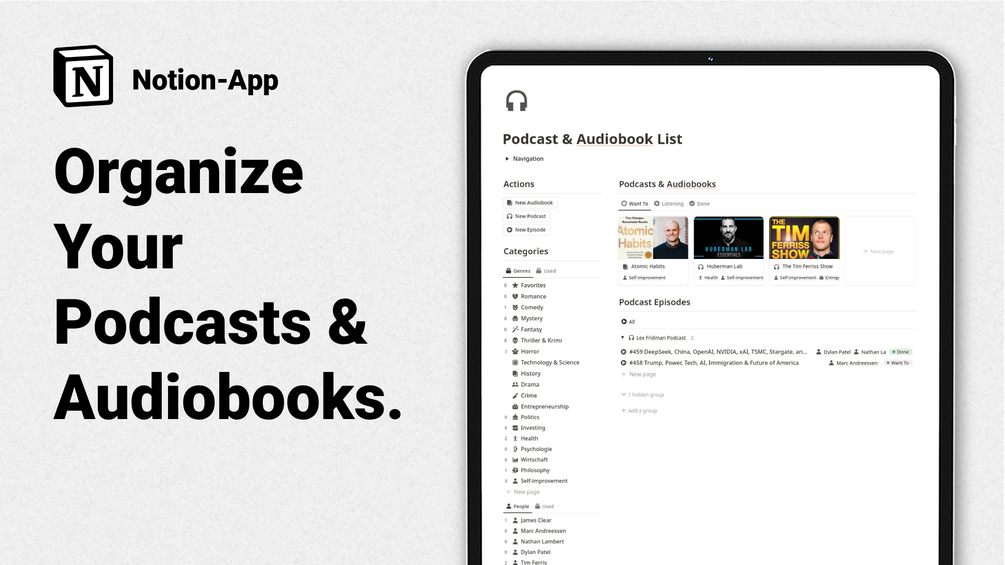 The Podcast & Audiobook template helps you stay organized and focused on your listening goals. Stay motivated, reflect on insights, and make the most of your audio learning journey with this easy-to-use system.